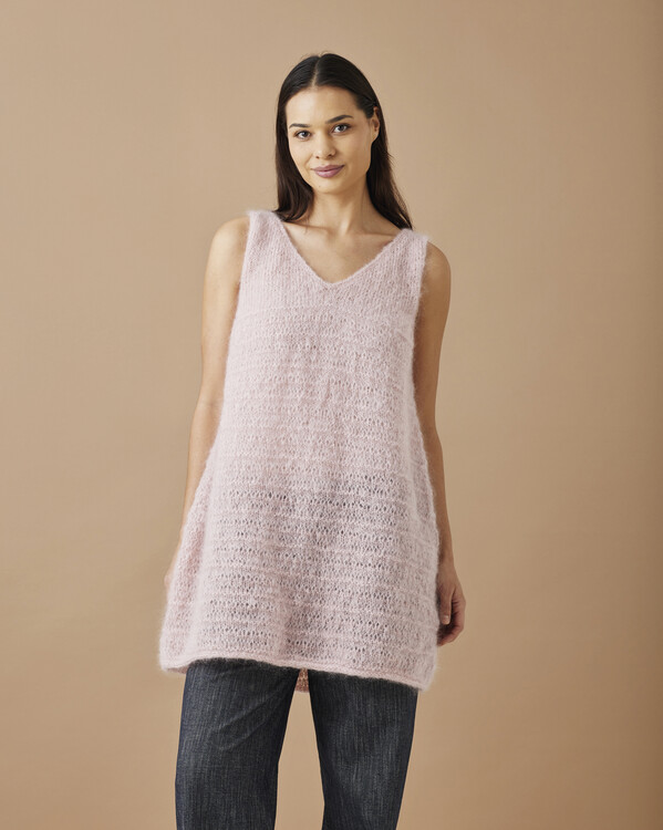 En stilren strikkeopskrift på en blød og luftig kjole i længere model med elegant V-udskæring.