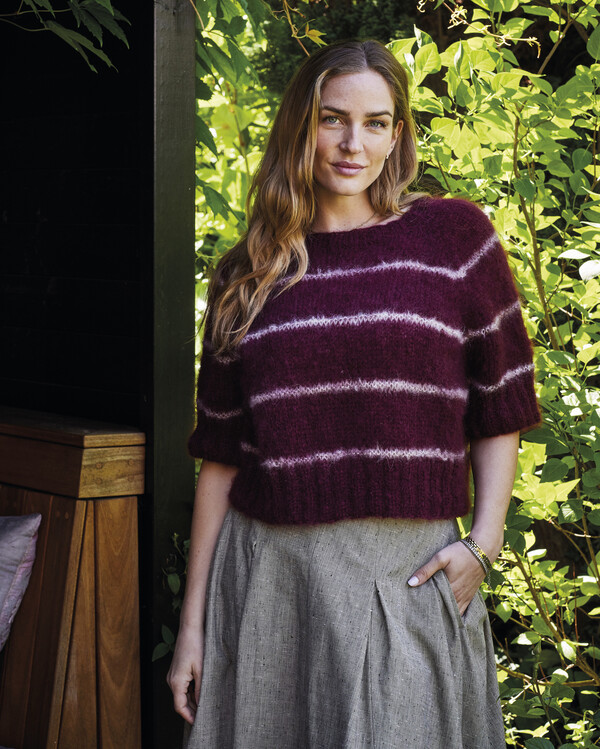 Den korte, boxy pasform og de halvlange ærmer giver et moderne udtryk, mens det luftige garn skaber en drømmende fornemmelse.