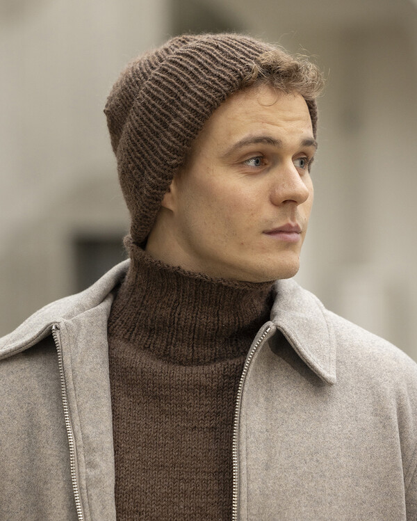 En enkel og stilren strikket hue i en blød, brun nuance. Modellen har en klassisk pasform med elastisk ribstrik, som gør, at den sidder behageligt og følger hovedets form.