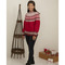Et stemningsfuldt strikkemønster til en rød sweater med dekorative borter i kontrastfarver.