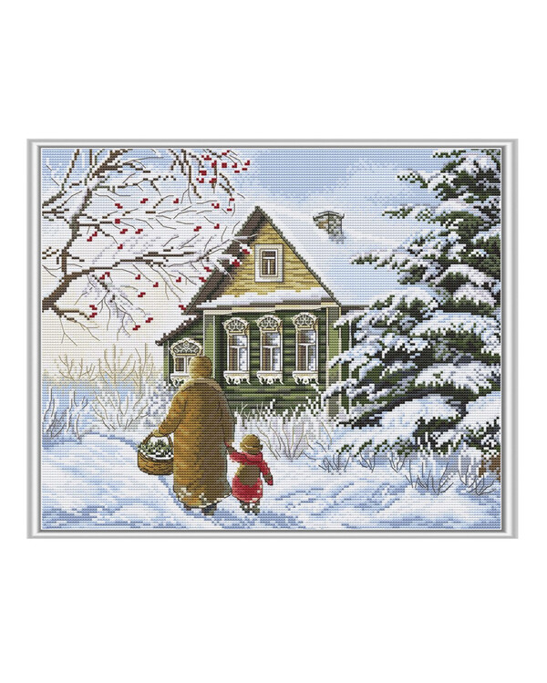 De bløde vinterfarver og den rolige scene skaber en nostalgisk og varm stemning. Et klassisk broderi, der fanger vinterens stilhed og familiens fællesskab.