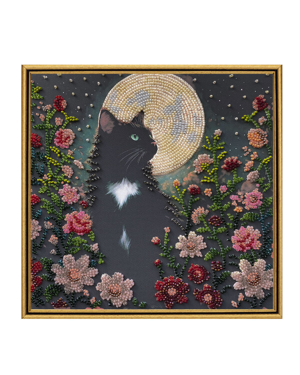 Et mystisk og stemningsfuldt perlebroderi med en sort kat, der sidder foran en lysende måne omgivet af blomster.
