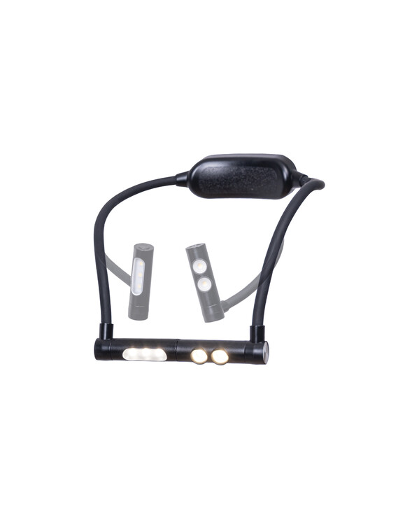 En bærbar nakkelampe med to justerbare lampehoveder, der sikrer klart og jævnt arbejdslys med to lysindstillinger – projektør og spotlight.