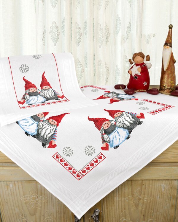 Broderes med moulinégarn i kors- og stikkesting efter tællemønster påtrykt 100 % bomuld. Færdig konfektioneret med indvævet bort.